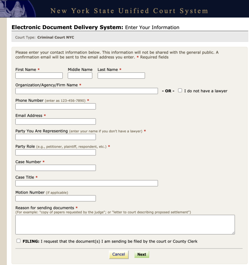 On the Getting Started page, users will find a User Manual, FAQ, and the EDDS Notice. Clicking “Next” will lead to the NYC Criminal Court Information Screen.