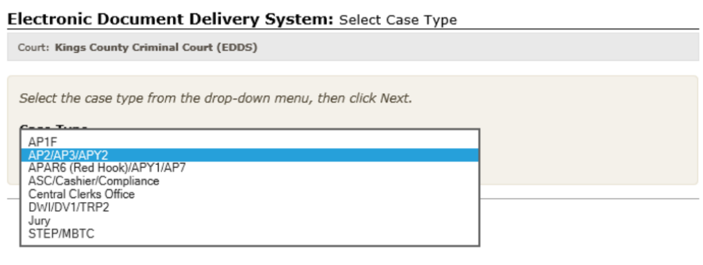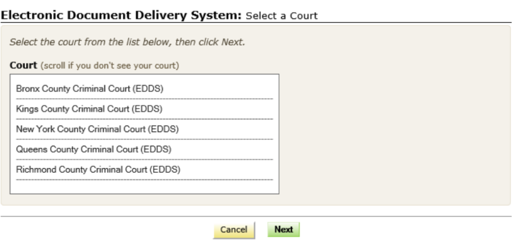 After completing the Information Screen, users will be directed to the Select a Court page. Here, they must choose the County Criminal Court where they intend to send their document. For example, if submitting to Kings County Criminal Court, that option should be selected.