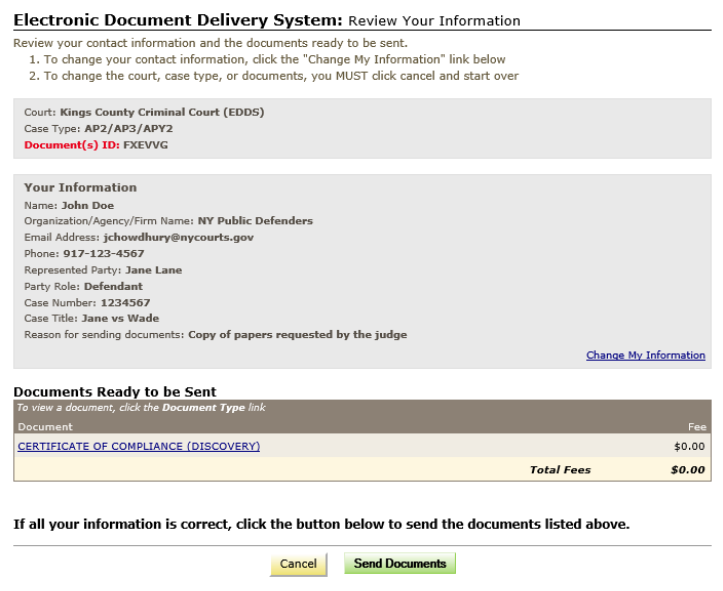- At the bottom of the screen, users will find a checkbox to request that the submitted document be “filed” by the court or County Clerk.