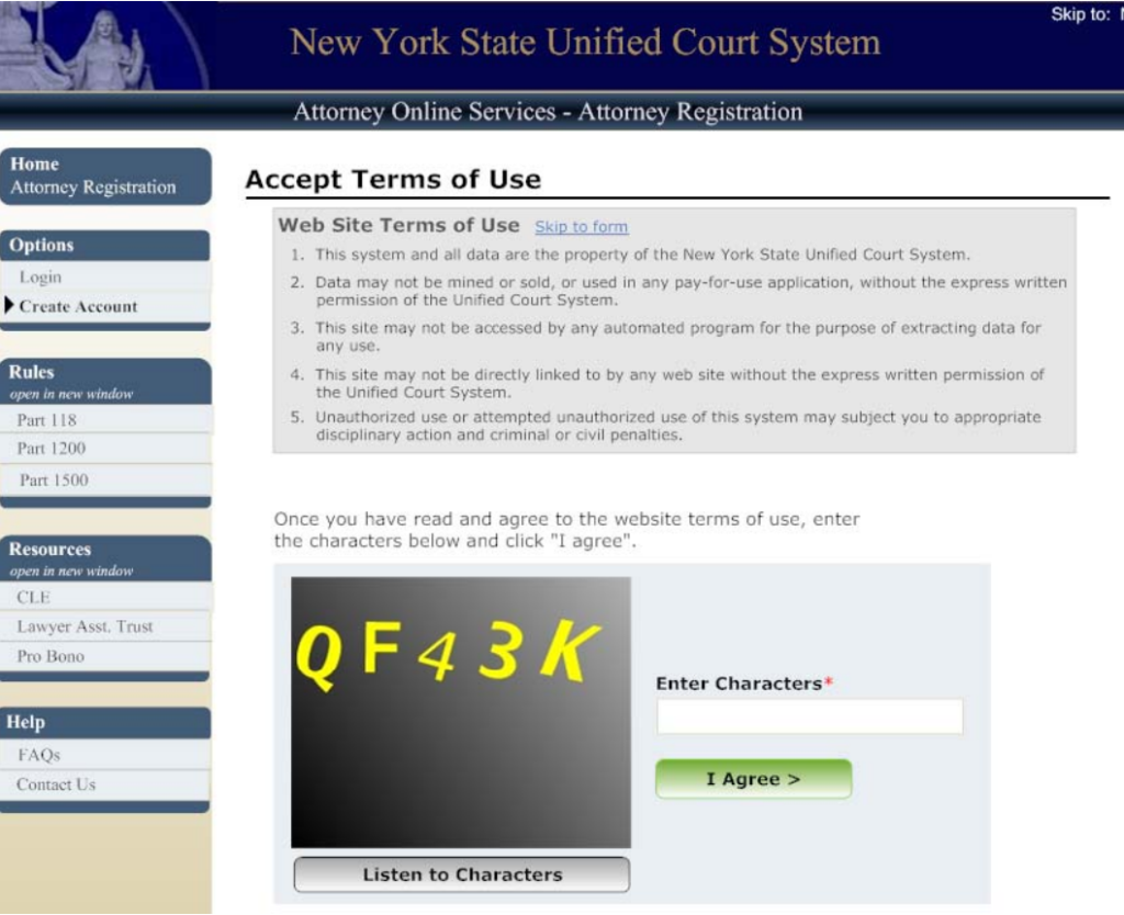 Should click on the “Create Attorney Online Services Account“ link. This will guide them through a series of steps to set up their AOS account. Once the account is created, they can select the icon on the final page to return to the NYSCEF login page. After agreeing to the NYSCEF Terms of Use, they will gain immediate access to the system.