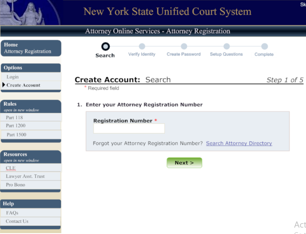 Attorneys must enter their Attorney Registration Number. Those who donโt know their number can click the “Search Attorney Directory“ link, which opens in a new window, to find it.