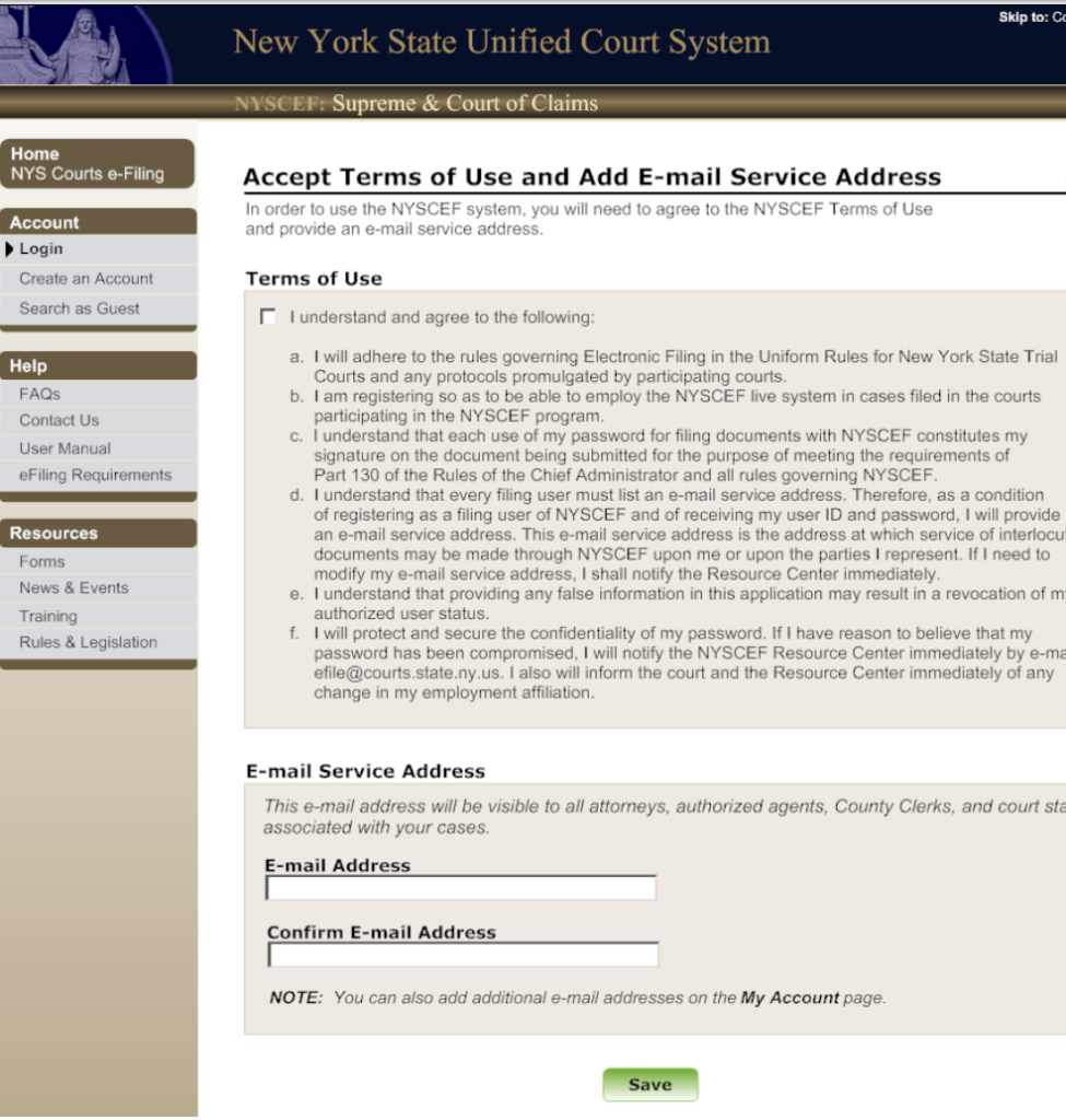 Upon the first successful login, users will be prompted to accept the NYSCEF Terms of Use and enter their email service address. This email will serve as the primary address for receiving service of documents in NYSCEF. This step is required only during the initial login and will not appear again.